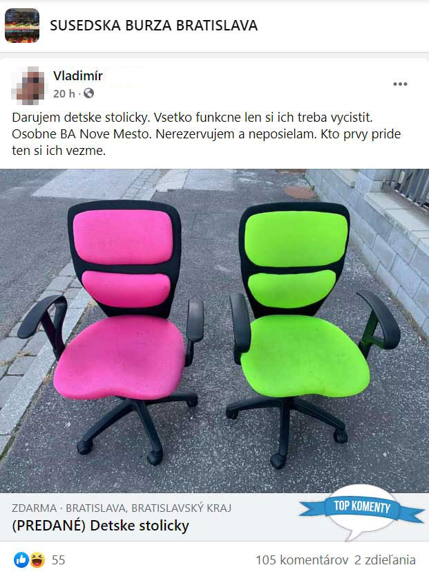 Keď sa stretnú ľudia so skvelým zmyslom pre humor, nemôže to dopadnúť inak, ako poriadnou groteskou. To dokázala aj skupina ľudí na Bratislavskej susedskej burze. Darovanie detských stoličiek sa premenilo na skvelú komédiu, pri ktorej sa smiechom budete váľať po zemi. Viac takýchto ľudí!