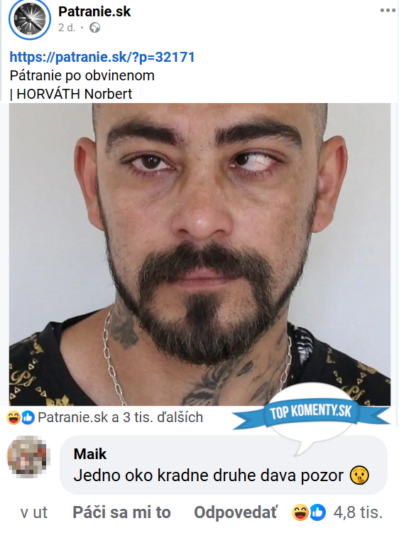 Polícia zverejňuje fotky hľadaných osôb, internet im zasa zverejňuje diagnózy. Keď sa pod príspevkami objavia tváre trestancov s pohľadom, ktorý by rozladil aj optometristu, slovenský a český humor nespí. Prinášame výber najvtipnejších komentárov, ktoré sú dôkazom, že ľudia majú postreh… aj keď niekedy až priveľký.